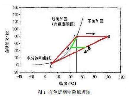 直接加熱技術體現在圖1中的路徑為A—B,B—C連線不與水分飽和曲線相交,有色煙羽可消除。特點是煙氣質量和含濕量不變,溫度升高。